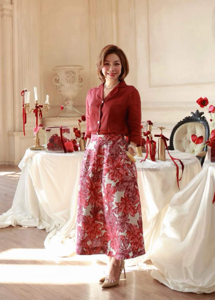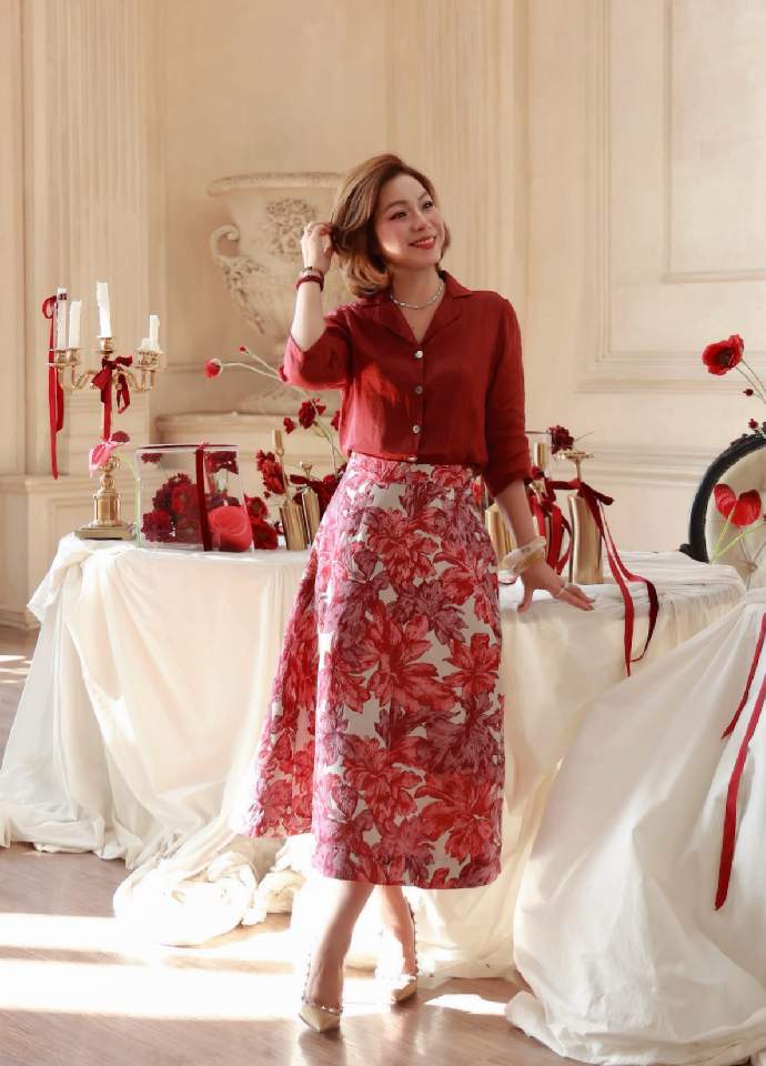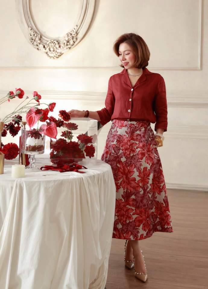 Chân váy gấm hoa diễu 2 bên sườn Red Floral