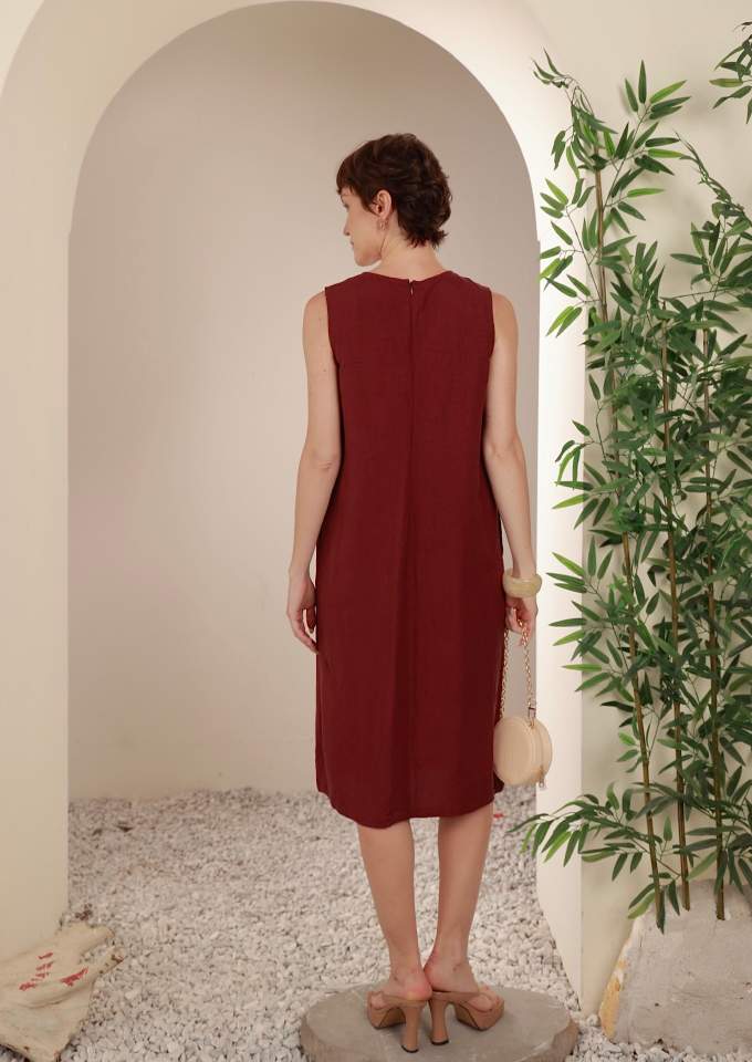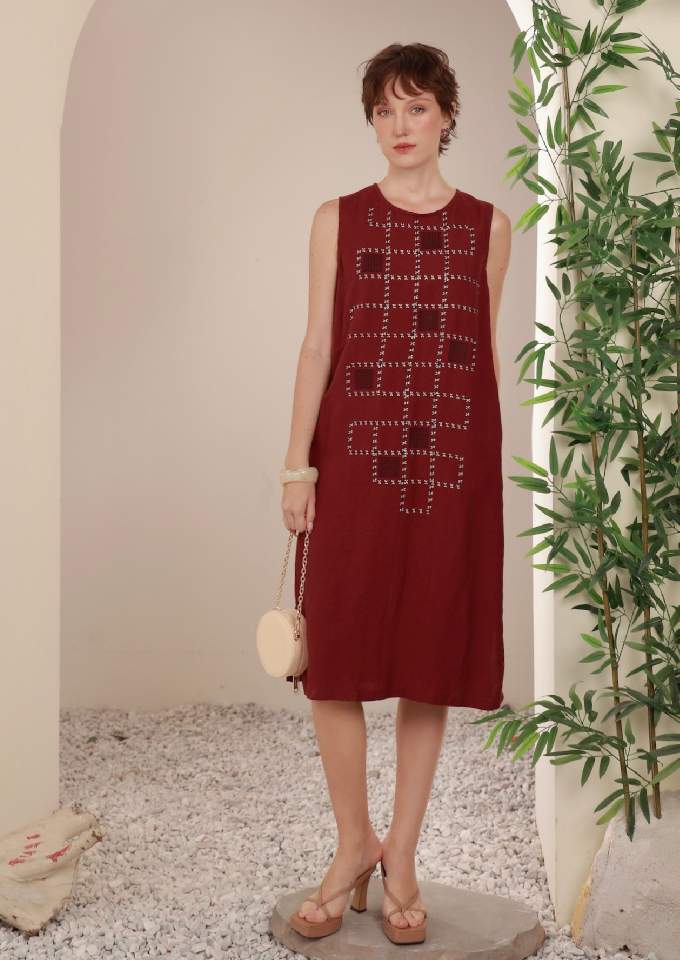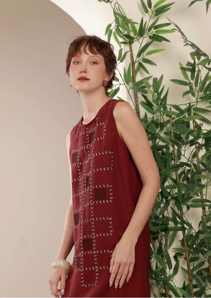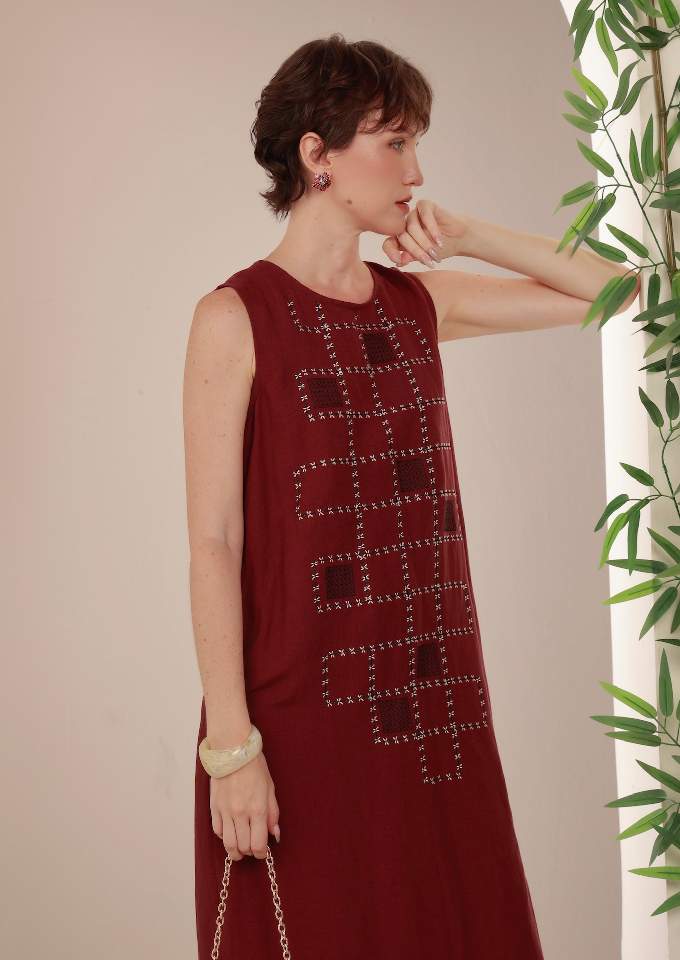 Đầm gile midi xẻ gấu thêu ô vuông Purple