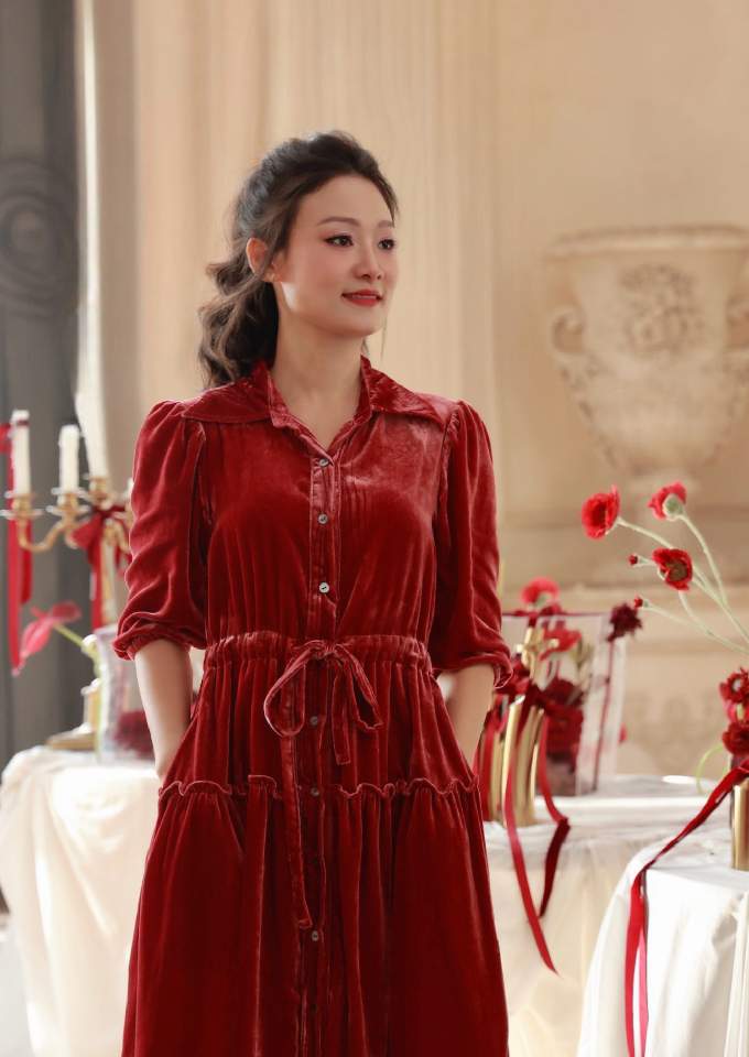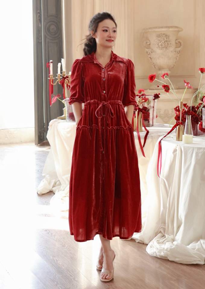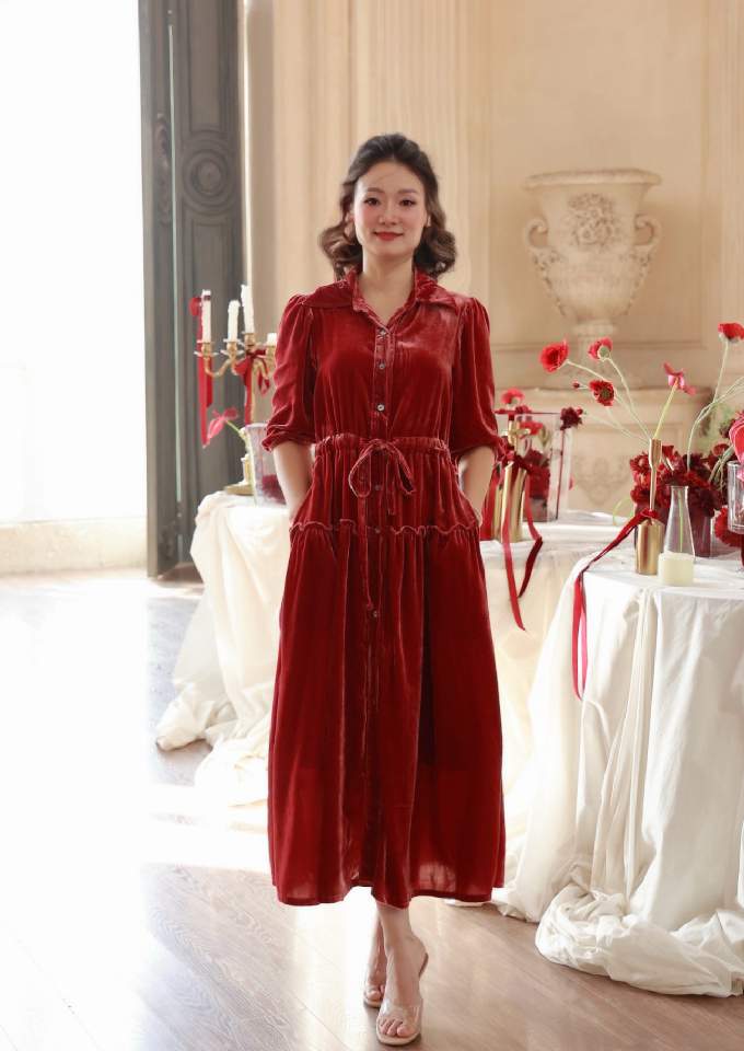 Hãy là người đầu tiên nhận xét “Đầm nhung cổ sơ mi rút dây eo, bèo hông Wine”