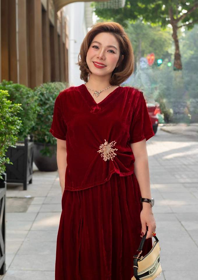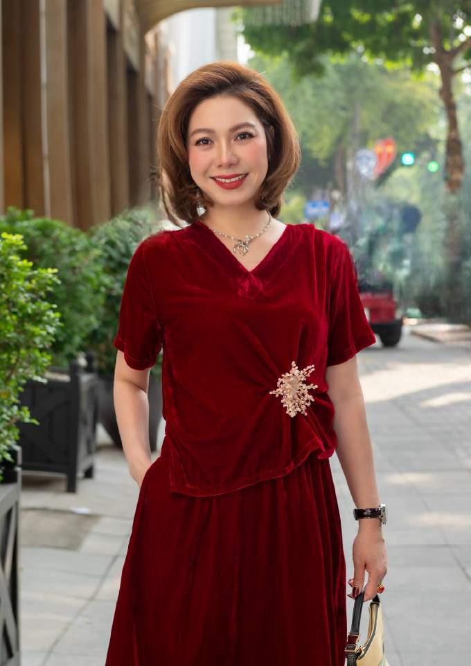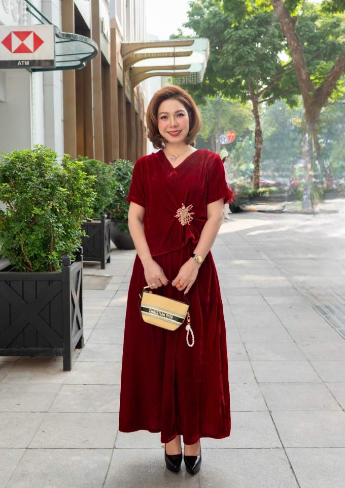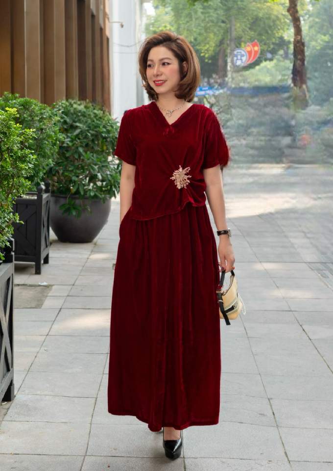 Đầm nhung đính hoa cổ tim chun eo hở bụng Wine