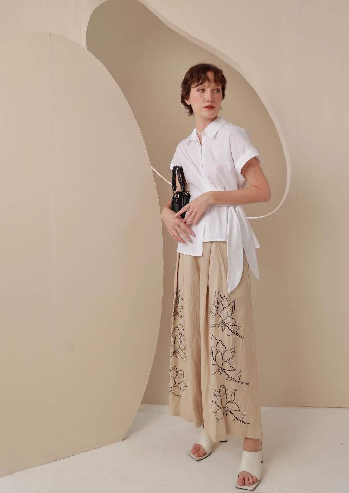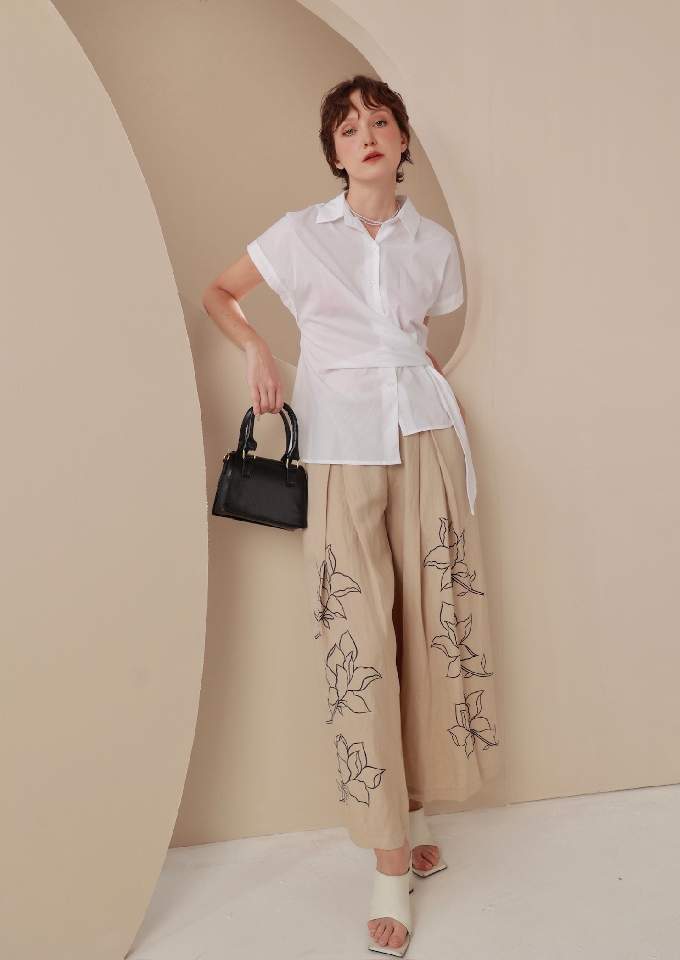 Quần ống rộng khóa sườn ly súp to thêu hoa Beige